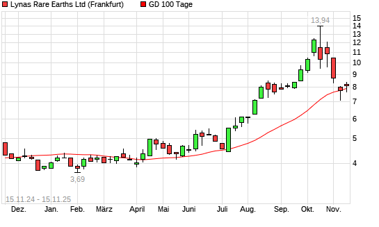 Mit dem Anstieg auf 8,10 EUR hat die Lynas-Aktie am 14.11.2025 die 100-Tage-Linie nach oben gekreuzt.Die Lynas-Aktie befindet sich seit dem 22.05.2025 im langfristigen Aufwärtstrend und hat ...weiterlesen