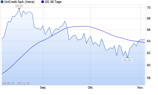 Mit dem Rücksetzer auf 63,40 EUR hat die UniCredit-Aktie am 04.11.2025 die 38-Tage-Linie nach unten gekreuzt.Die UniCredit-Aktie befindet sich seit dem 03.12.2024 im langfristigen Aufwärtstrend ...weiterlesen