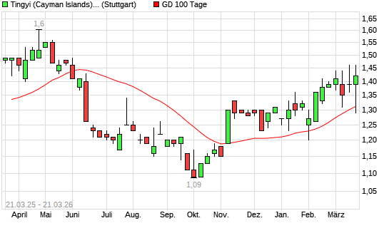 Mit dem Rücksetzer auf 1,28 EUR hat die Tingyi (Cayman Islands) Holding-Aktie am 20.03.2026 die 100-Tage-Linie nach unten gekreuzt.Die Tingyi (Cayman Islands) Holding-Aktie ...weiterlesen