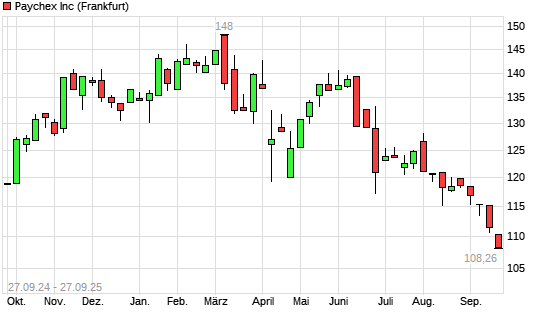 Mit dem Rücksetzer auf 108,26 EUR hat die Paychex-Aktie (ISIN US7043261079) am 26.09.2025 ein neues 12-Monats-Tief erreicht und damit den Kurs vom 25.09.2025 eingestellt.Die Paychex-Aktie ...weiterlesen
