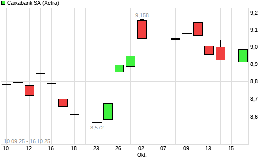 Mit dem Anstieg auf 9,18 EUR hat die Caixabank-Aktie (ISIN ES0140609019) am 15.10.2025 ein neues All-Time-High erreicht und damit den Kurs vom 10.10.2025 eingestellt.Die Caixabank-Aktie befindet ...weiterlesen