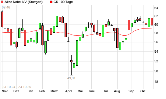 Mit dem Rücksetzer auf 59,02 EUR hat die Akzo Nobel-Aktie am 22.10.2025 die 100-Tage-Linie nach unten gekreuzt.Die Akzo Nobel-Aktie befindet sich seit dem 20.08.2025 im langfristigen Aufwärtstrend ...weiterlesen