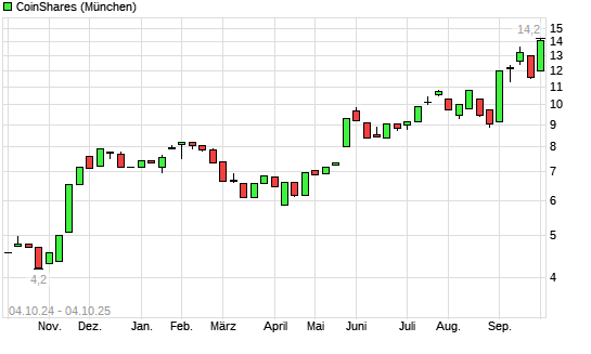 Mit dem Anstieg auf 13,68 EUR hat die COINSHARES I.-Aktie (ISIN JE00BLD8Y945) am 03.10.2025 ein neues All-Time-High erreicht und damit den Kurs vom 02.10.2025 eingestellt.Der Abstand zur ...weiterlesen