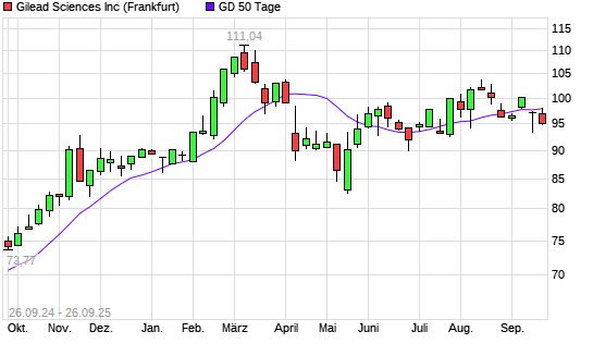 Mit dem Rücksetzer auf 96,79 EUR hat die Gilead Sciences-Aktie am 25.09.2025 die 50-Tage-Linie nach unten gekreuzt.Die Gilead Sciences-Aktie befindet sich seit dem 24.09.2025 im langfristigen ...weiterlesen