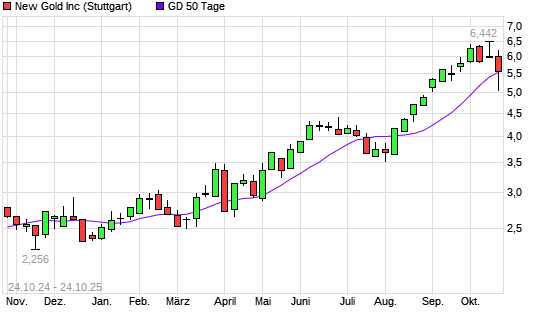 Mit dem Anstieg auf 5,66 EUR hat die New Gold-Aktie am 23.10.2025 die 50-Tage-Linie nach oben gekreuzt.Der Abstand zur 200-Tage-Linie beträgt aktuell +43,38%. ...weiterlesen