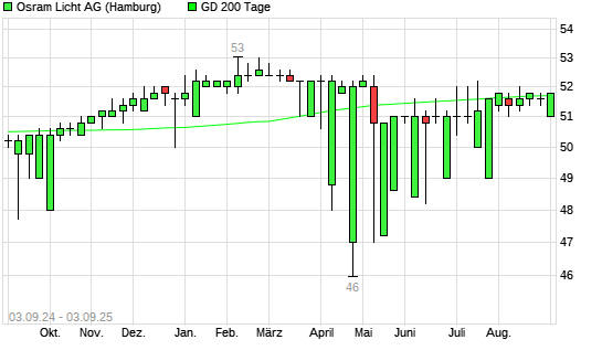 Mit dem Anstieg auf 51,80 EUR hat die Osram Licht-Aktie am 02.09.2025 die 200-Tage-Linie nach oben gekreuzt.Die Osram Licht-Aktie befand sich seit dem 25.08.2025 im langfristigen Abwärtstrend ...weiterlesen