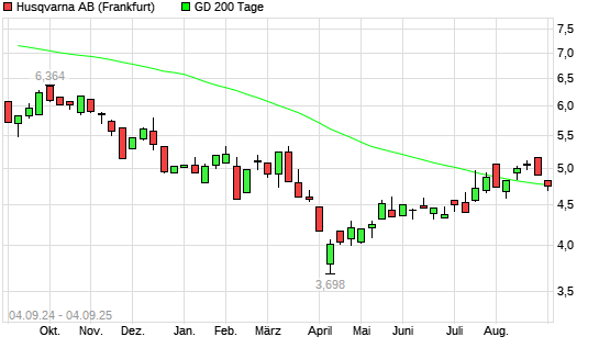 Mit dem Rücksetzer auf 4,70 EUR hat die Husqvarna-Aktie am 03.09.2025 die 200-Tage-Linie nach unten gekreuzt.Die Husqvarna-Aktie befand sich seit dem 08.08.2025 im langfristigen Aufwärtstrend ...weiterlesen