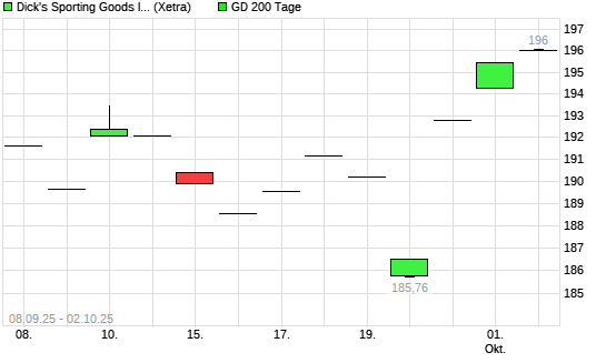 Mit dem Anstieg auf 186,06 EUR hat die Dick's Sporting Goods-Aktie am 01.10.2025 die 200-Tage-Linie nach oben gekreuzt.Die Dick's Sporting Goods-Aktie befand sich seit dem 30.09.2025 im langfristigen ...weiterlesen