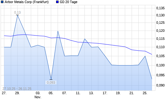 Mit dem Anstieg auf 0,11 EUR hat die Arbor Metals-Aktie am 25.11.2025 die 20-Tage-Linie nach oben gekreuzt.Die Arbor Metals-Aktie befindet sich seit dem 26.03.2025 im langfristigen Abwärtstrend ...weiterlesen