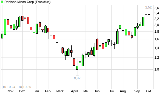 Mit dem Anstieg auf 2,45 EUR hat die Denison Mines-Aktie (ISIN CA2483561072) am 09.10.2025 ein neues 10-Jahres-Hoch erreicht und damit den Kurs vom 23.09.2025 eingestellt.Die Denison Mines-Aktie ...weiterlesen