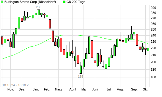 Mit dem Anstieg auf 228,00 EUR hat die BURLINGTON STORES-Aktie am 09.10.2025 die 200-Tage-Linie nach oben gekreuzt.Die BURLINGTON STORES-Aktie befand sich seit dem 15.09.2025 im langfristigen ...weiterlesen