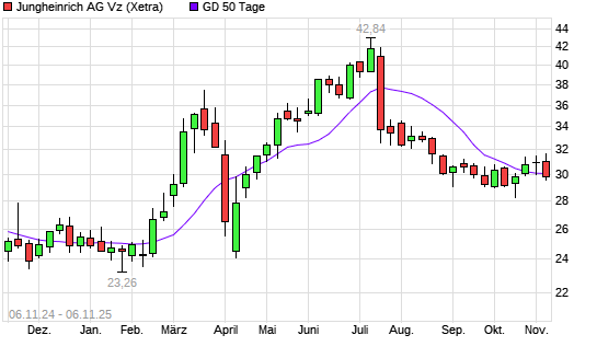 Mit dem Rücksetzer auf 29,94 EUR hat die Jungheinrich Vz-Aktie am 05.11.2025 die 50-Tage-Linie nach unten gekreuzt.Die Jungheinrich Vz-Aktie befindet sich seit dem 26.08.2025 im langfristigen ...weiterlesen