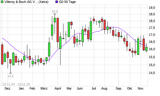 Mit dem Rücksetzer auf 15,95 EUR hat die Villeroy & Boch Vz-Aktie am 12.11.2025 die 50-Tage-Linie nach unten gekreuzt.Die Villeroy & Boch Vz-Aktie befindet sich seit dem 28.10.2025 ...weiterlesen