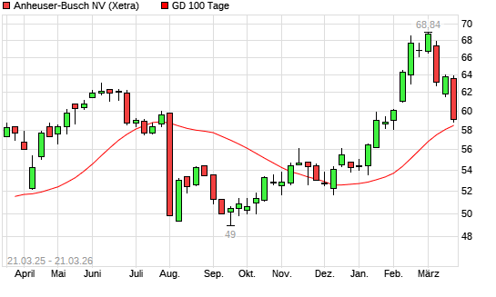 Mit dem Rücksetzer auf 57,92 EUR hat die AB InBev-Aktie am 20.03.2026 die 100-Tage-Linie nach unten gekreuzt.Die AB InBev-Aktie befindet sich seit dem 08.01.2026 im ...weiterlesen
