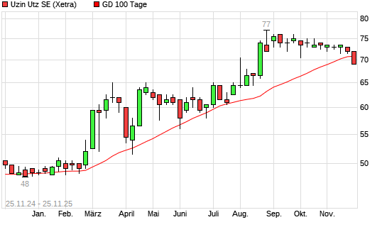 Mit dem Rücksetzer auf 69,50 EUR hat die Uzin Utz-Aktie am 24.11.2025 die 100-Tage-Linie nach unten gekreuzt.Die Uzin Utz-Aktie befindet sich seit dem 04.02.2025 im langfristigen Aufwärtstrend ...weiterlesen