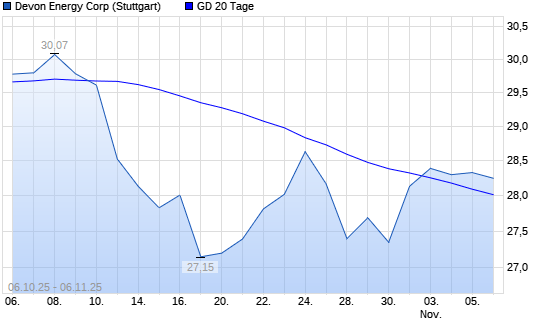 Mit dem Anstieg auf 28,54 EUR hat die Devon Energy-Aktie am 05.11.2025 die 20-Tage-Linie nach oben gekreuzt.Die Devon Energy-Aktie befindet sich seit dem 30.09.2025 im langfristigen Abwärtstrend ...weiterlesen