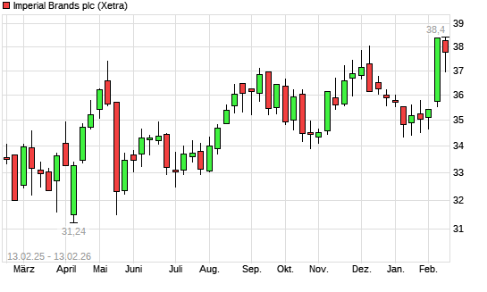 Mit dem Anstieg auf 38,12 EUR hat die Imperial Brands-Aktie (ISIN GB0004544929) am 12.02.2026 ein neues 5-Jahres-Hoch erreicht und damit den Kurs vom 06.02.2026 eingestellt.Die ...weiterlesen