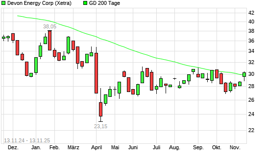 Mit dem Anstieg auf 30,46 EUR hat die Devon Energy-Aktie am 12.11.2025 die 200-Tage-Linie nach oben gekreuzt.Die Devon Energy-Aktie befand sich seit dem 11.11.2025 im langfristigen Abwärtstrend ...weiterlesen
