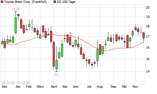 Mit dem Rücksetzer auf 16,43 EUR hat die Toyota Motor-Aktie am 20.11.2025 die 100-Tage-Linie nach unten gekreuzt.Die Toyota Motor-Aktie befindet sich seit dem 15.10.2025 im langfristigen ...weiterlesen