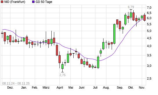 Mit dem Rücksetzer auf 5,75 EUR hat die Nio-Aktie am 07.11.2025 die 50-Tage-Linie nach unten gekreuzt.Die Nio-Aktie befindet sich seit dem 22.07.2025 im langfristigen Aufwärtstrend und ...weiterlesen