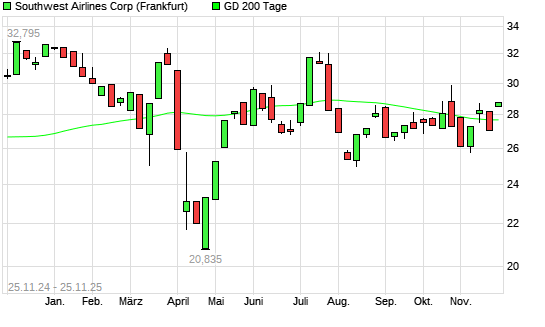 Mit dem Anstieg auf 28,48 EUR hat die Southwest Airlines-Aktie am 24.11.2025 die 200-Tage-Linie nach oben gekreuzt.Die Southwest Airlines-Aktie befand sich seit dem 21.11.2025 im langfristigen ...weiterlesen