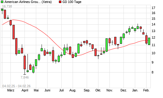 Mit dem Anstieg auf 12,00 EUR hat die American Airlines-Aktie am 03.02.2026 die 100-Tage-Linie nach oben gekreuzt.Die American Airlines-Aktie befindet sich seit dem 19.11.2025 im langfristigen ...weiterlesen