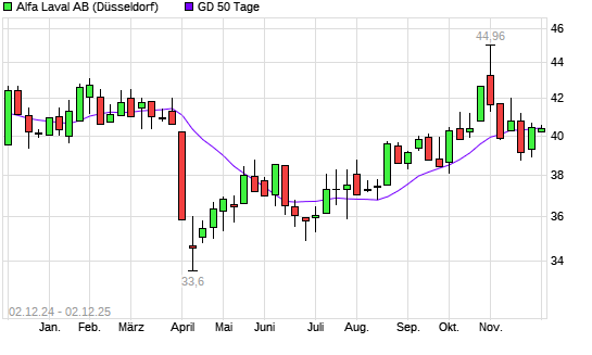 Mit dem Rücksetzer auf 40,22 EUR hat die Alfa Laval-Aktie am 01.12.2025 die 50-Tage-Linie nach unten gekreuzt.Die Alfa Laval-Aktie befindet sich seit dem 01.10.2025 im langfristigen Aufwärtstrend ...weiterlesen