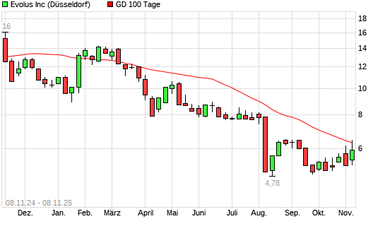 Mit dem Rücksetzer auf 6,15 EUR hat die Evolus-Aktie am 07.11.2025 die 100-Tage-Linie nach unten gekreuzt.Die Evolus-Aktie befindet sich seit dem 07.03.2025 im langfristigen Abwärtstrend ...weiterlesen