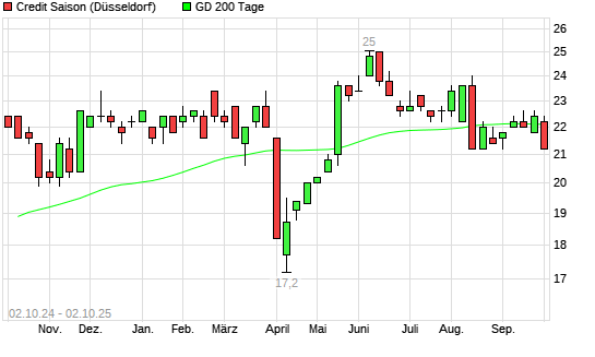 Mit dem Rücksetzer auf 22,40 EUR hat die Credit Saison-Aktie am 01.10.2025 die 200-Tage-Linie nach unten gekreuzt.Die Credit Saison-Aktie befand sich seit dem 26.09.2025 im langfristigen ...weiterlesen