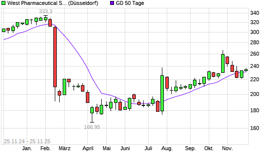 Mit dem Anstieg auf 234,50 EUR hat die West Pharmaceutical Services-Aktie am 24.11.2025 die 50-Tage-Linie nach oben gekreuzt.Die West Pharmaceutical Services-Aktie befindet sich seit dem 01.10.2025 ...weiterlesen