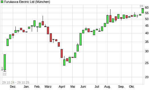 Mit dem Anstieg auf 58,50 EUR hat die Furukawa Electric-Aktie (ISIN JP3827200001) am 28.10.2025 ein neues 10-Jahres-Hoch erreicht und damit den Kurs vom 05.08.2025 eingestellt.Die Furukawa Electric-Aktie ...weiterlesen