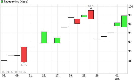 Mit dem Anstieg auf 98,72 EUR hat die Tapestry-Aktie (ISIN US8760301072) am 02.10.2025 ein neues All-Time-High erreicht und damit den Kurs vom 23.09.2025 eingestellt.Die Tapestry-Aktie befindet ...weiterlesen