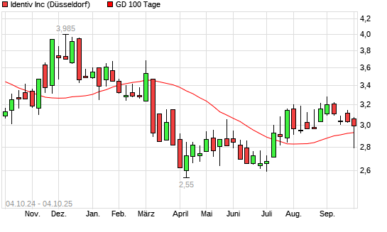 Mit dem Anstieg auf 2,94 EUR hat die Identiv-Aktie am 03.10.2025 die 100-Tage-Linie nach oben gekreuzt.Die Identiv-Aktie befindet sich seit dem 30.09.2025 im langfristigen Abwärtstrend und hat ...weiterlesen