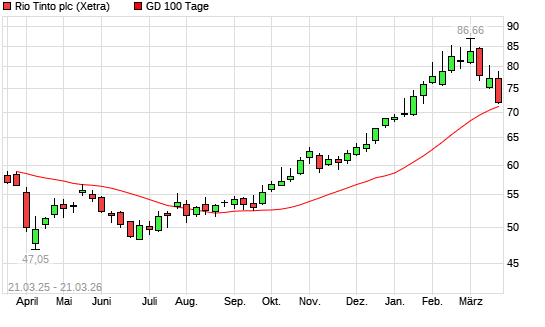 Mit dem Rücksetzer auf 71,27 EUR hat die Rio Tinto plc-Aktie am 20.03.2026 die 100-Tage-Linie nach unten gekreuzt.Die Rio Tinto plc-Aktie befindet sich seit dem 25.09.2025 ...weiterlesen