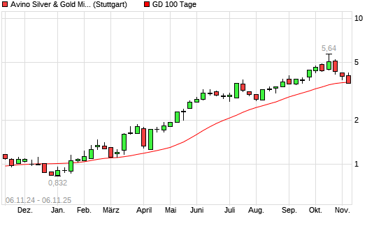 Mit dem Rücksetzer auf 3,62 EUR hat die Avino Silver & Gold Mines-Aktie am 05.11.2025 die 100-Tage-Linie nach unten gekreuzt.Die Avino Silver & Gold Mines-Aktie befindet sich seit dem ...weiterlesen
