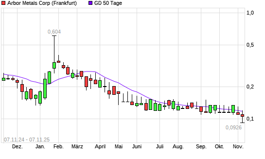 Mit dem Anstieg auf 0,12 EUR hat die Arbor Metals-Aktie am 06.11.2025 die 50-Tage-Linie nach oben gekreuzt.Die Arbor Metals-Aktie befindet sich seit dem 26.03.2025 im langfristigen Abwärtstrend ...weiterlesen