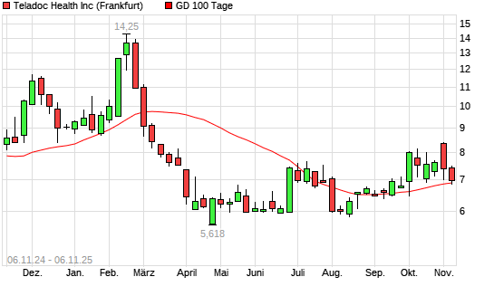 Mit dem Rücksetzer auf 6,87 EUR hat die Teladoc Health-Aktie am 05.11.2025 die 100-Tage-Linie nach unten gekreuzt.Die Teladoc Health-Aktie befindet sich seit dem 04.11.2025 im langfristigen ...weiterlesen