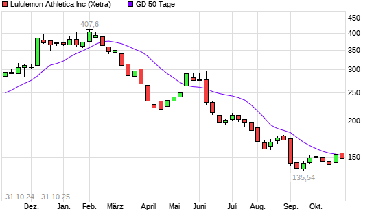 Mit dem Rücksetzer auf 147,00 EUR hat die Lululemon Athletica-Aktie am 30.10.2025 die 50-Tage-Linie nach unten gekreuzt.Die Lululemon Athletica-Aktie befindet sich seit dem 28.03.2025 im ...weiterlesen