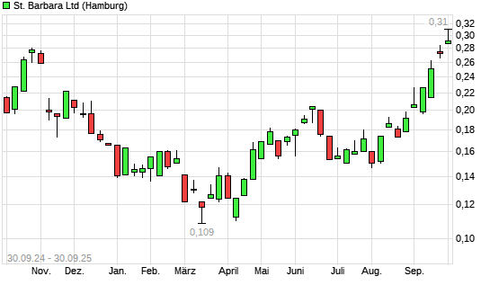 Mit dem Anstieg auf 0,31 EUR hat die St. Barbara-Aktie (ISIN AU000000SBM8) am 29.09.2025 ein neues 3-Jahres-Hoch erreicht und damit den Kurs vom 22.10.2024 eingestellt.Die St. Barbara-Aktie ...weiterlesen