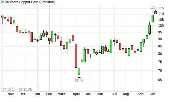 Mit dem Anstieg auf 113,00 EUR hat die Southern Copper-Aktie (ISIN US84265V1052) am 06.10.2025 ein neues 12-Monats-Hoch erreicht und damit den Kurs vom 03.10.2025 eingestellt.Die Southern Copper-Aktie ...weiterlesen
