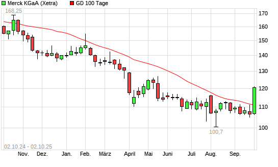 Mit dem Anstieg auf 119,95 EUR hat die Merck-Aktie am 01.10.2025 die 100-Tage-Linie nach oben gekreuzt.Die Merck-Aktie befindet sich seit dem 24.10.2024 im langfristigen Abwärtstrend und hat ...weiterlesen