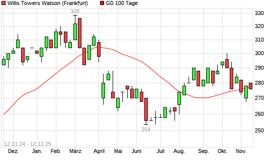 Mit dem Rücksetzer auf 276,00 EUR hat die Willis Towers Watson-Aktie am 11.11.2025 die 100-Tage-Linie nach unten gekreuzt.Die Willis Towers Watson-Aktie befindet sich seit dem 24.10.2025 ...weiterlesen