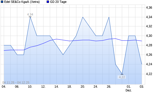 Mit dem Rücksetzer auf 4,22 EUR hat die Edel-Aktie am 03.12.2025 die 20-Tage-Linie nach unten gekreuzt.Die Edel-Aktie befindet sich seit dem 24.10.2025 im langfristigen Aufwärtstrend und ...weiterlesen