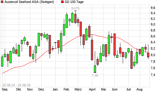 Mit dem Rücksetzer auf 7,90 EUR hat die Austevoll Seafood-Aktie am 21.08.2025 die 100-Tage-Linie nach unten gekreuzt.Die Austevoll Seafood-Aktie befindet sich seit dem 30.05.2025 im langfristigen ...weiterlesen