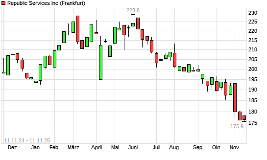 Mit dem Rücksetzer auf 175,90 EUR hat die Republic Services-Aktie (ISIN US7607591002) am 10.11.2025 ein neues 12-Monats-Tief erreicht und damit den Kurs vom 07.11.2025 eingestellt.Die Republic ...weiterlesen