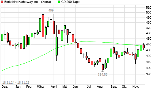Mit dem Rücksetzer auf 436,20 EUR hat die Berkshire Hathaway B-Aktie am 17.11.2025 die 200-Tage-Linie nach unten gekreuzt.Die Berkshire Hathaway B-Aktie befand sich seit dem 13.11.2025 ...weiterlesen