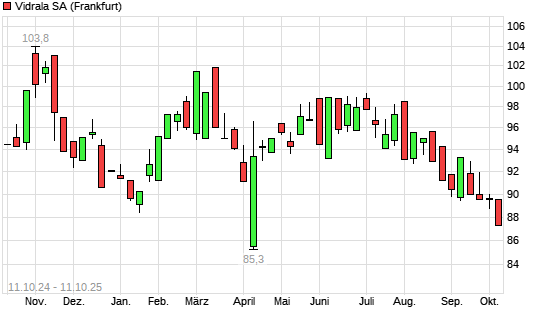 Mit dem Rücksetzer auf 87,30 EUR hat die VIDRALA SA INH.-Aktie (ISIN ES0183746314) am 10.10.2025 ein neues 6-Monats-Tief erreicht und damit den Kurs vom 30.09.2025 eingestellt.Die VIDRALA ...weiterlesen