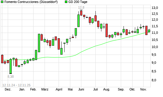 Mit dem Anstieg auf 11,30 EUR hat die Fomento Construcciones-Aktie am 11.11.2025 die 200-Tage-Linie nach oben gekreuzt.Die Fomento Construcciones-Aktie befand sich seit dem 07.11.2025 im langfristigen ...weiterlesen