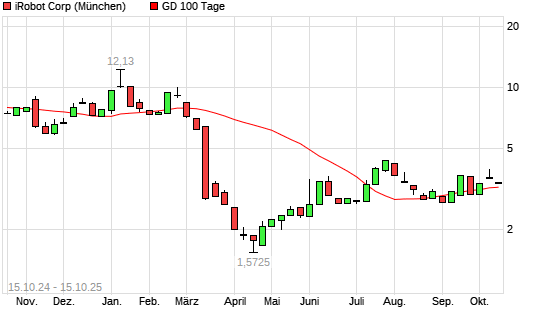 Mit dem Rücksetzer auf 3,19 EUR hat die iRobot-Aktie am 14.10.2025 die 100-Tage-Linie nach unten gekreuzt.Die iRobot-Aktie befindet sich seit dem 24.02.2025 im langfristigen Abwärtstrend ...weiterlesen