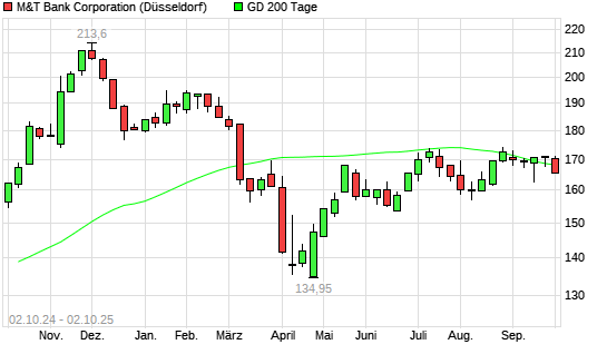 Mit dem Rücksetzer auf 166,45 EUR hat die M&T Bank-Aktie am 01.10.2025 die 200-Tage-Linie nach unten gekreuzt.Die M&T Bank-Aktie befand sich seit dem 24.09.2025 im langfristigen Aufwärtstrend ...weiterlesen